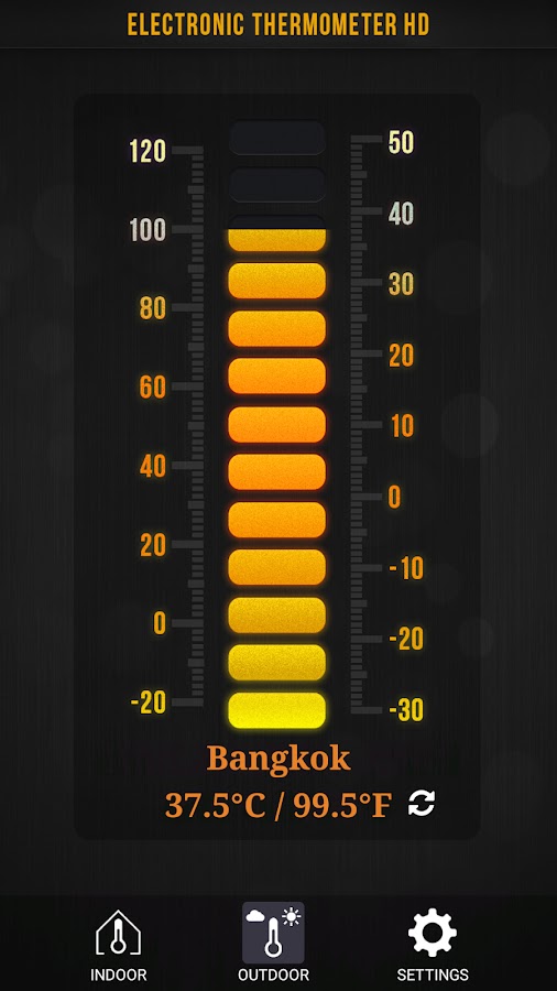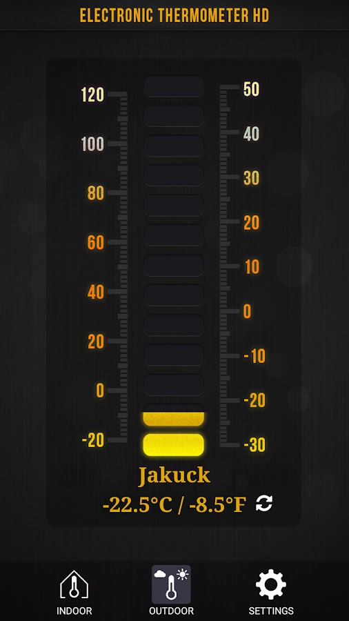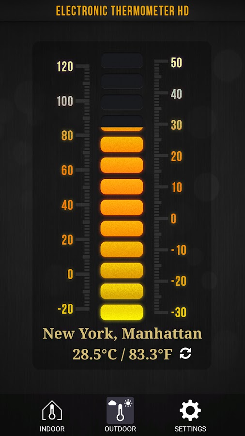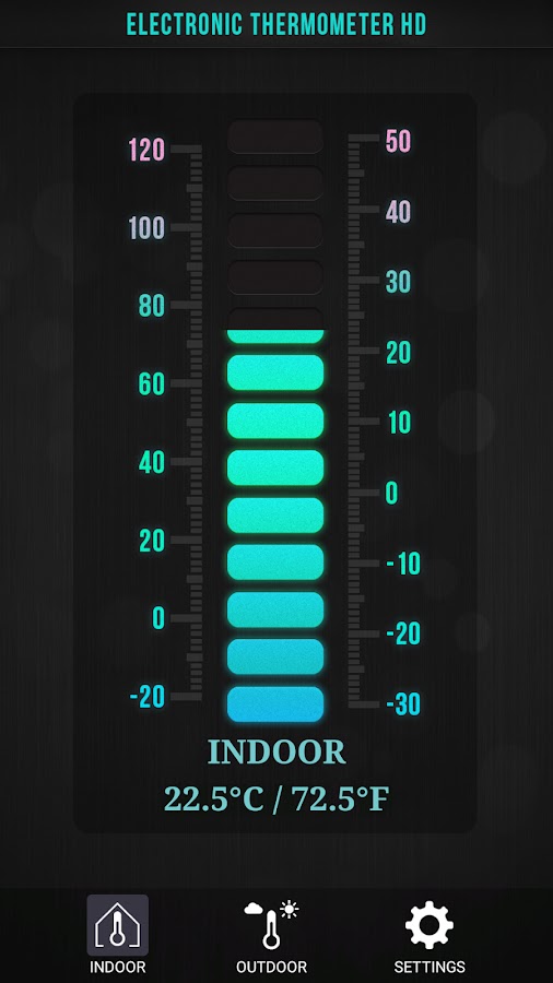 Это приложение представляет собой термометр, который отображает температуру в помещении и на улице (шкала Цельсия и Фаренгейта).