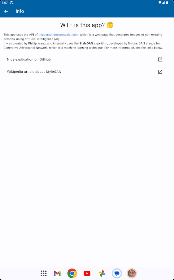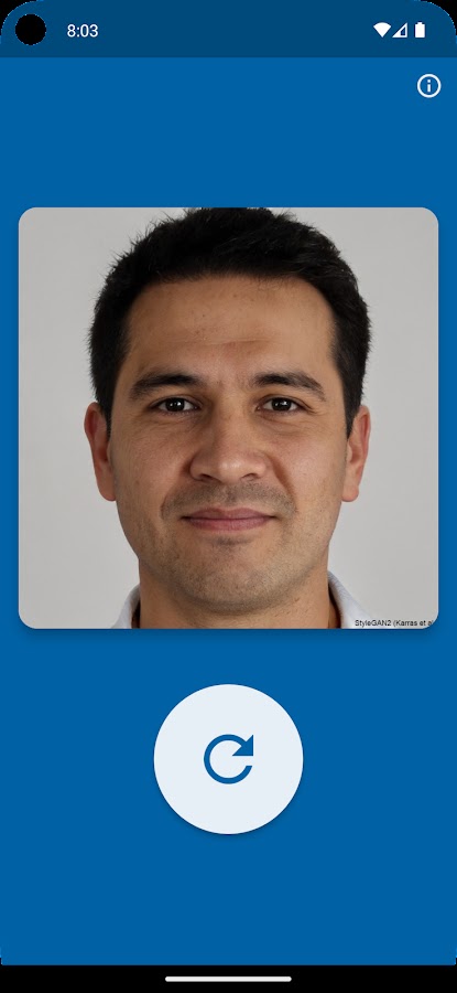 Это приложение использует API-интерфейс thispersondoesnotexist.com, веб-страницы, генерирующей изображения несуществующих людей с помощью искусственного интеллекта (ИИ). Он был создан Филиппом Вангом и внутри использует алгоритм StyleGAN, разработанный Nvidia. GAN расшифровывается как Generative Adversarial Network, которая представляет собой метод машинного обучения. Для получения дополнительной информации см. ссылки ниже.