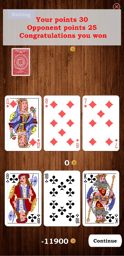 Если один игроков набрал 31 очко то игра останавливается и игроки подсчитывают очки, выигрывает игрок набравший наибольшее количество карт.