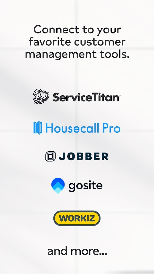 Упростите управление заказами, упростите рабочий процесс и выполняйте больше заказов. Подключитесь к своим любимым партнерским инструментам и сервисам, включая Housecall Pro, GoSite, Service Titan, Календарь Google и другие. Благодаря этой бесшовной интеграции вы получите качественную работу и сможете легко и эффективно управлять своим бизнесом.