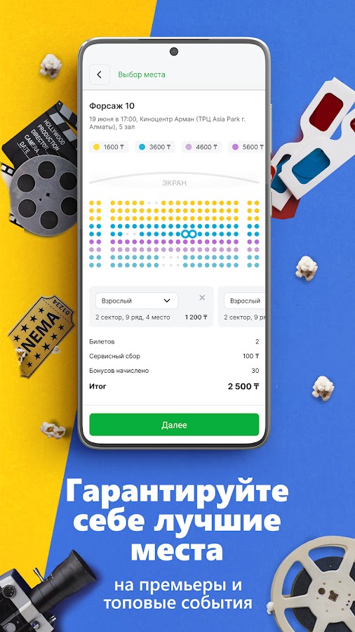 Покупая через приложение, ваши билеты автоматически становятся доступны в личном кабинете — просто покажите его с экрана мобильного телефона контроллеру на входе в зал, либо, в случае с некоторыми кинотеатрами, обменяйте на настоящий билет – мы усердно работаем над тем, чтобы клиенты Тикетон повсюду могли пройти на сеанс, минуя кассу.
