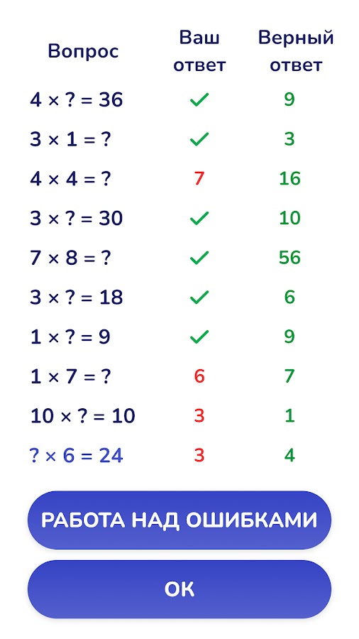 ✅ Вы можете тренировать таблицу умножения до 10, 20 и даже 30