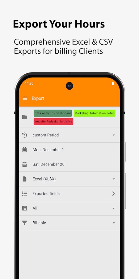 Табель учета рабочего времени позволяет вам регистрировать рабочее время одним нажатием кнопки. Вы можете легко добавлять перерывы, расходы и заметки. Управляйте проектами и экспортируйте данные в Microsoft Excel (XLSX, CSV). Понятные обзоры и статистика обеспечат вам наилучший рабочий опыт. Простое резервное копирование и восстановление на SD-карту или Dropbox/Drive!
