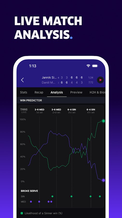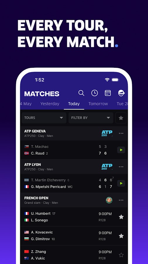 Следите за нашими комментариями в режиме реального времени (для избранных матчей), прогнозируйте результаты и голосуйте за того, кто, по вашему мнению, победит. Получайте поминутные обновления во время матчей туров ATP, WTA, ATP Challenger и ITF. Настройте push-уведомления, чтобы получать уведомления о матчах для отдельных матчей и любого матча, в котором участвует ваш любимый игрок. Предупреждения включают: перерывы в подаче, окончательный результат, конец партии, устранение, технические победы, напоминания о матче и многое другое. Будь то неожиданный результат или техническая победа в последний момент, мы можем держать вас в курсе.