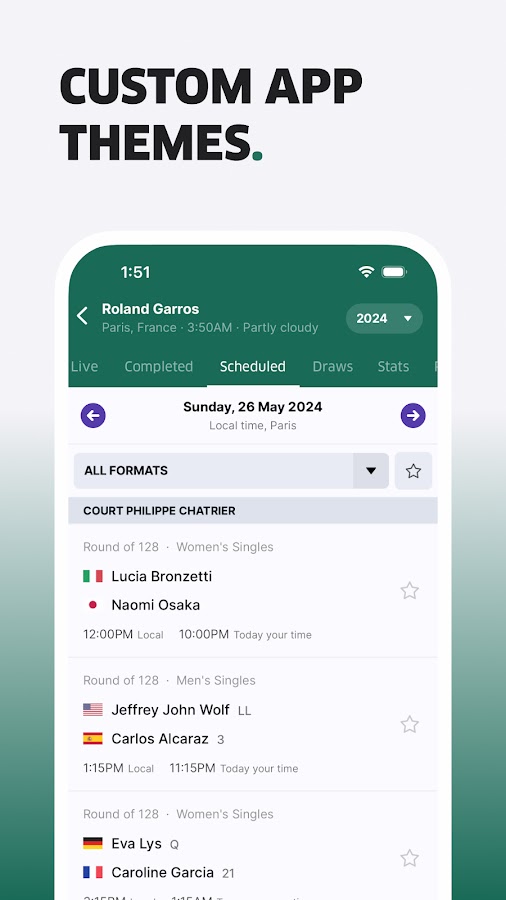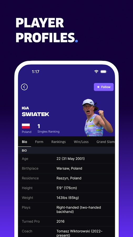 Если вы без ума от Роджера Федерера или Рафаэля Надаля, без ума от тенниса ATP или WTA, выберите своих любимых теннисистов и матчи, чтобы узнавать самые свежие результаты, новости тенниса и расписания, которые важны для вас.