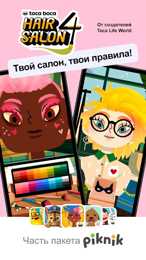 Toca Boca Hair Salon 4 теперь входит в Piknik — одна подписка, бесконечные способы играть и учиться! Получи полный доступ к лучшим в мире приложениям для дошкольников от Toca Boca, Sago Mini и Originator с безлимитным планом.