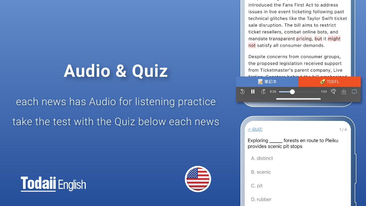 Todai Easy English News — это приложение для самостоятельного изучения английского языка через новости каждый день. Новости разделены на уровни от простого к сложному, помогая пользователям быстро и эффективно улучшить свои навыки аудирования, разговорной речи, чтения и письма на английском языке.