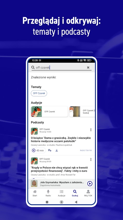 С этим приложением вы можете слушать радиостанцию TOK FM так, как вам удобно. Здесь вы найдете радиостанции в прямом эфире (в том числе без рекламы) и все передачи TOK FM в виде подкастов, доступных для прослушивания в любое время. С помощью приложения вы также можете слушать радио и подкасты в автомобиле – на смартфоне или устройстве с поддержкой Android Auto.