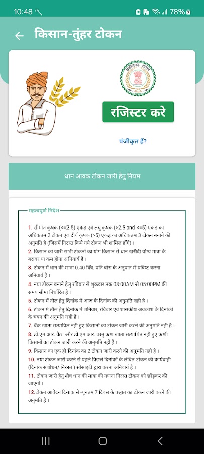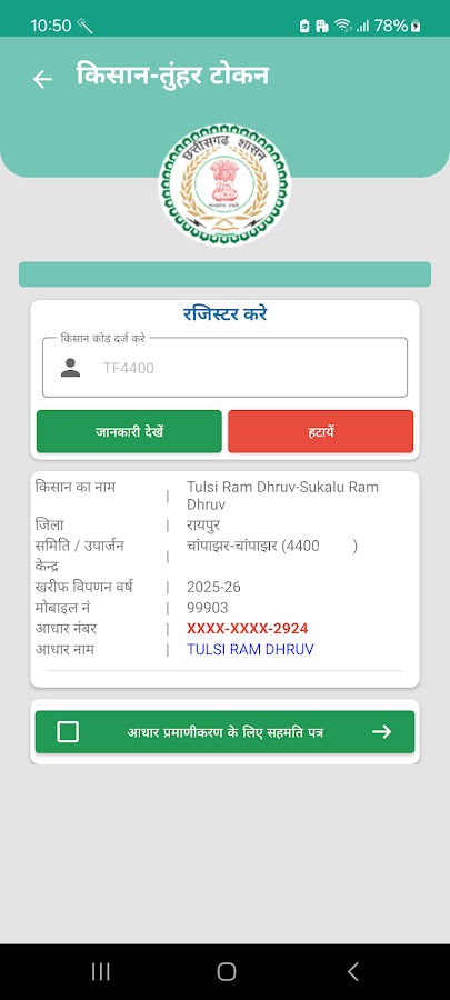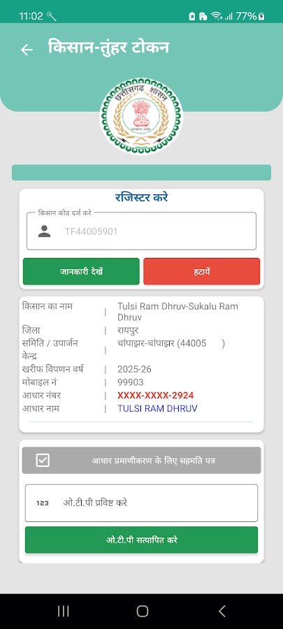 Приложение Token Tuhar для Android разработано для систематического управления процессом выдачи токенов зарегистрированным фермерам Чхаттисгарха для покупки риса. С помощью этого приложения каждый фермер может получить токен для продажи риса в соответствующем пункте закупки в назначенную им дату. Приложение будет получать всю актуальную информацию о фермере, его земельном участке, банковском счете, токенах и покупке риса.