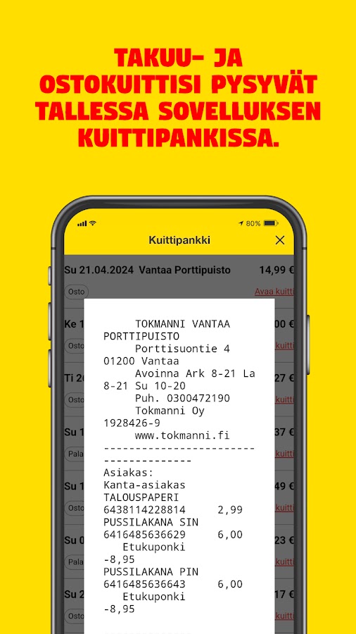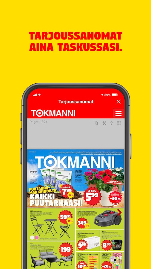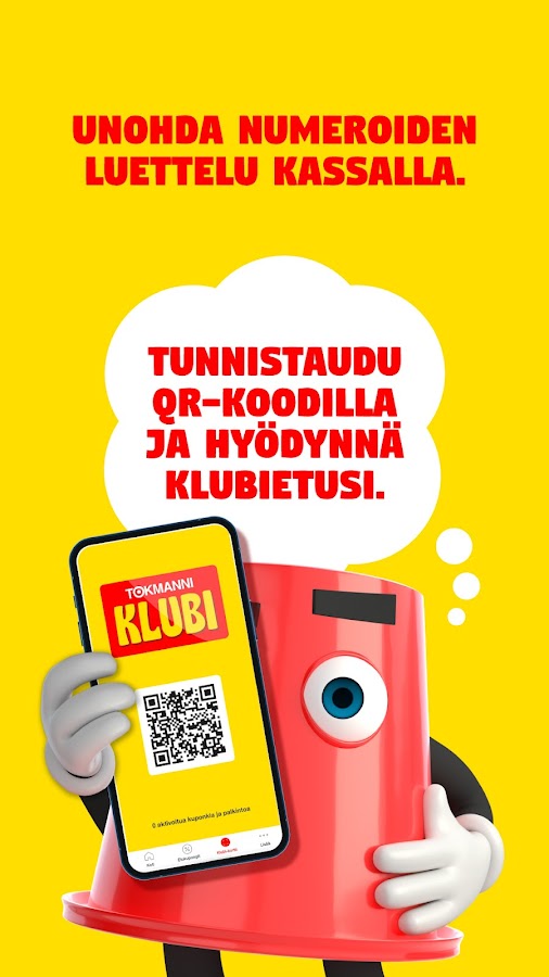 Приложение «Токманни» доступно членам «Токманни Клуба» бесплатно! Просто войдите в систему, используя свои существующие учетные данные, или зарегистрируйтесь в качестве члена клуба через приложение. Более подробную информацию о Клубе, условиях использования и защите данных вы можете найти на нашем сайте. Наша служба поддержки клиентов рада помочь по всем вопросам, связанным с Клубом и приложением (asiakaspalvelu@tokmanni.fi)
