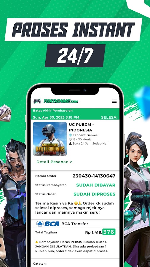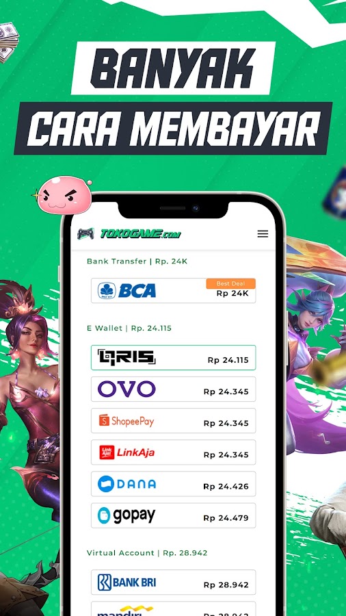 Tokogame также предлагает наиболее полные способы оплаты: из электронных кошельков, таких как OVO, DANA, Gopay, ShopeePay, LinkAja, QRIS, виртуальных счетов таких банков, как BCA Transfer, Bank BRI, Mandiri, Permata Bank, BNI, BSI, BJB, CIMB. , Danamon и Bank Sampoerna, а также банковские переводы через BCA. Также доступны Telkomsel, Indosat, SmartFren, Axis, Tri, XL кредит и платежи через Indomaret и Alfamart. Благодаря этому всем геймерам очень удобно пополнять счет и приобретать ваучеры цифровых приложений.