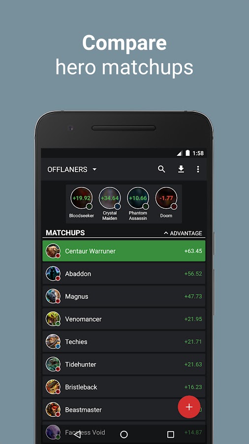 Найдите лучших встречных пиков и героев, которых следует избегать. Здесь нет ничего плохого — только жесткая статистика! База данных по совпадению героев приложения может быть обновлена в любое время, поэтому у вас всегда будут самые свежие данные. Все эти функциональные возможности обернуты в красивый, производительный пользовательский интерфейс Material Design !