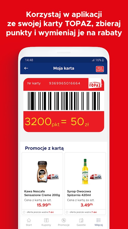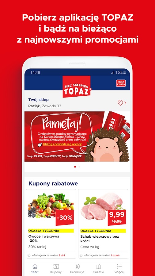 Установите приложение польской сети магазинов TOPAZ и просматривайте самые актуальные акции, вдохновляйтесь интересными статьями и рецептами вкусных блюд. Но это еще не все! С помощью приложения вы всегда быстро найдете ближайший магазин и не пропустите рекламные предложения.