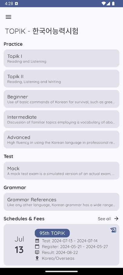 Независимо от того, готовитесь ли вы к школе, работе или личным целям, TOPIK Exam предоставляет вам простой способ ежедневно практиковаться и укреплять уверенность перед реальным экзаменом.