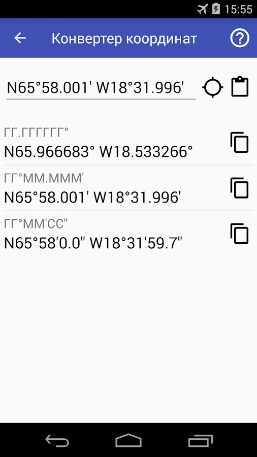 — Конвертер координат, позволяющий преобразовывать географические координаты из различных форматов в форматы, наиболее широко используемые в средствах навигации, приложениях и онлайн-сервисах;