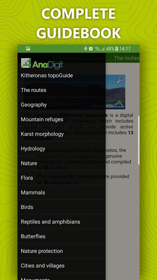Команда картографов Topoguide ранее опубликовала сотни подробных пешеходных карт Греции. Чтобы обеспечить точность данных, все маршруты, представленные в нашем приложении, проходятся или ездят нашей командой.