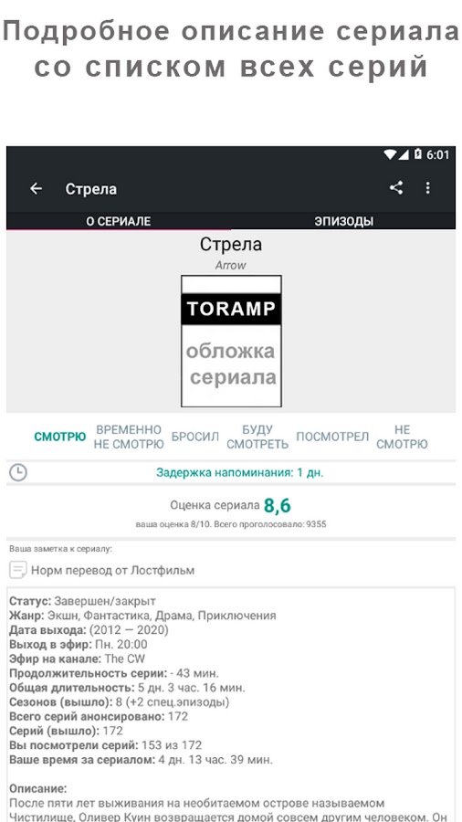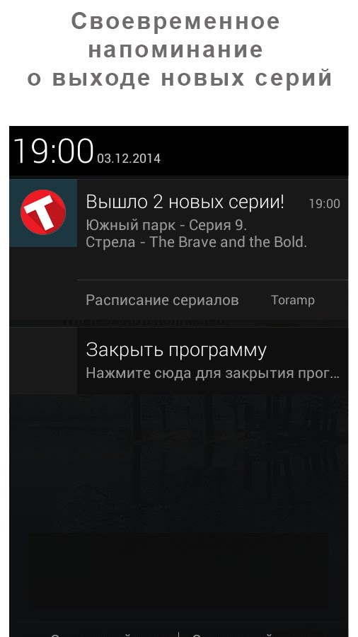 Программа является приложением для сайта Торамп с помощью которой вы сможете отслеживать график выхода ваших любимых сериалов, и получать своевременное уведомление при выходе новой серии.