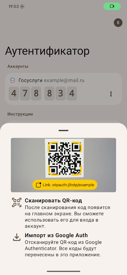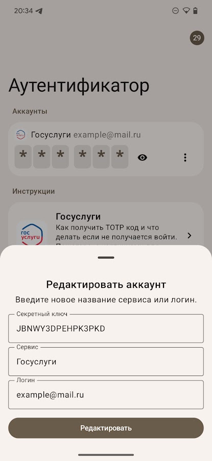 ТОТР Аутентификатор генерирует 6-значные ТОТР коды. Эти коды запрашивает сайт (например, Госуслуги или ВК)