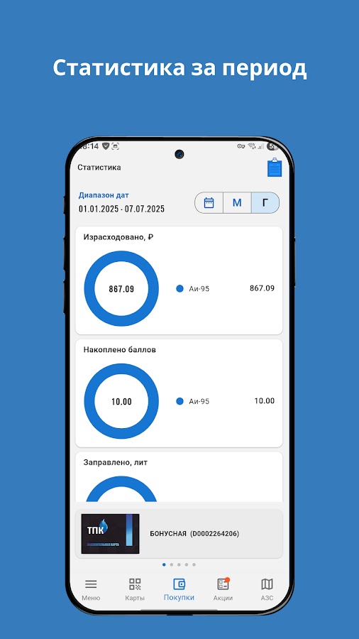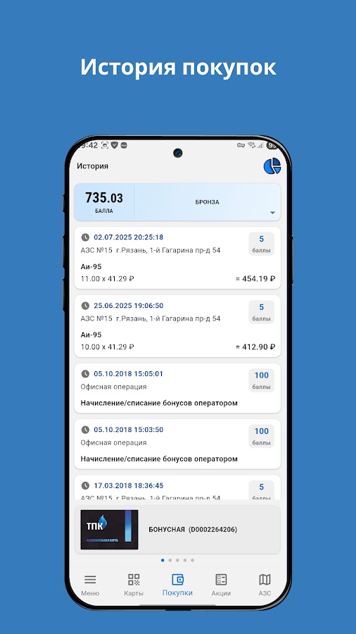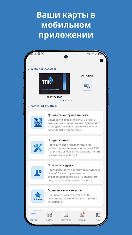 • Создавайте виртуальные карты сети АЗС ТПК из приложения.