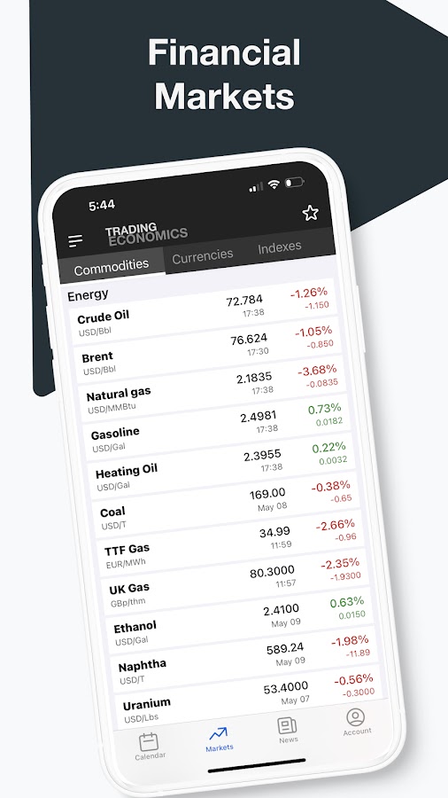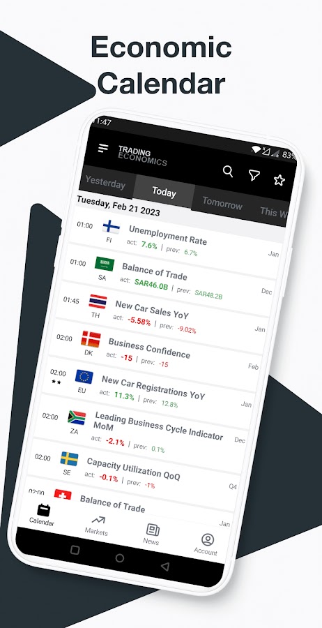 Приложение Trading Economics предоставляет своим пользователям экономический календарь, обменные курсы, индексы фондового рынка, доходность государственных облигаций и цены на товары. Пользователи также могут получать оповещения об экономических показателях в момент их публикации. Установите целевые цены, изменение цены, запишите оповещения о максимуме/минимуме для финансовых рынков. С более чем 1,5 миллиарда просмотров страниц из более чем 200 стран TradingEconomics.com является мировым справочником. Наши данные основаны на официальных источниках, а не на сторонних поставщиках данных, и наши факты регулярно проверяются на наличие несоответствий.