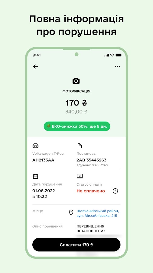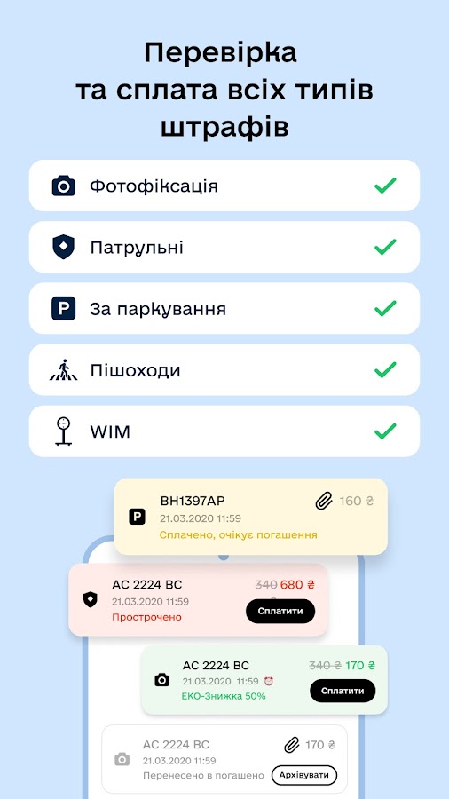 1️⃣ в Украине приложение, которое следует концепции Держава у смартфоні (Дия) для быстрой онлайн оплаты штрафов ПДД, за нарушение правил парковки авто, отслеживание статуса штрафа после оплаты, хранения квитанций и покупки электронных полисов автогражданки (ОСАГО). После того, как вы оплатили штраф, мы сообщим вам о статусе его погашения.