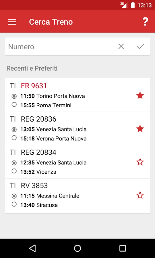 Ищите все расписания поездов Италии и покупайте билеты на поезд с помощью Orario Treni, приложения для поездов №1 в Италии. Orario Treni — это удобный планировщик поездок для всех туристов и местных жителей. Выбрано Google как одно из лучших приложений 2016 года в Италии.