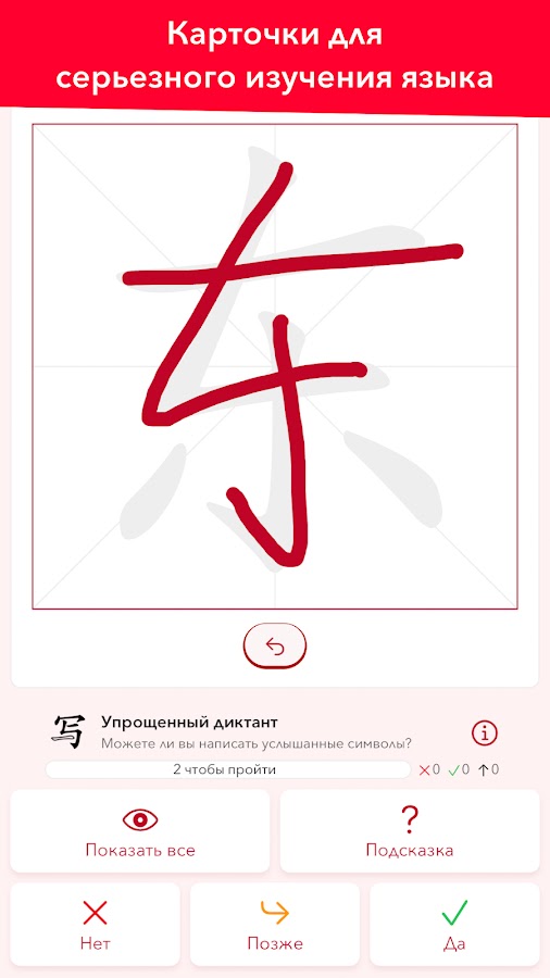 ★ Учитесь так, как вам захочется: каждая карточка доступна для изучения в четырех режимах, которые проверяют ваши знания с различных сторон. Узнайте, насколько хорошо вы усвоили значение слова с помощью режима Перевод, или же выберите режим Письмо и сравните порядок черт в ваших иероглифах с нашей анимацией!