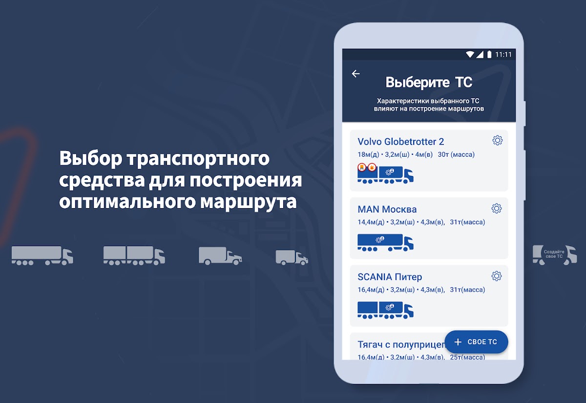 В Тракте вы можете выбрать тип грузового транспорта из предложенных, либо создать свои транспортные средства и задать им характеристики, необходимые для правильного построения маршрутов.