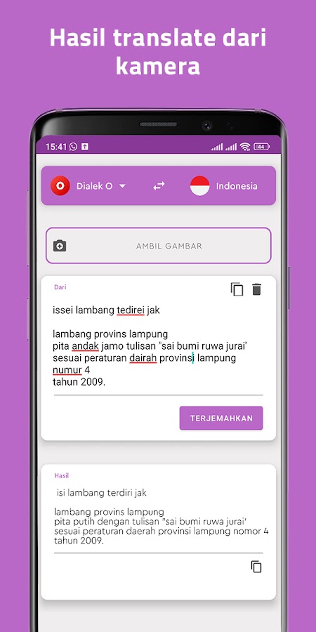 Хотите быстро переводить язык Лампунга без необходимости печатать? Приложение Translate Lampung Language использует технологию распознавания изображений (OCR), которая позволяет переводить текст всего одним снимком!