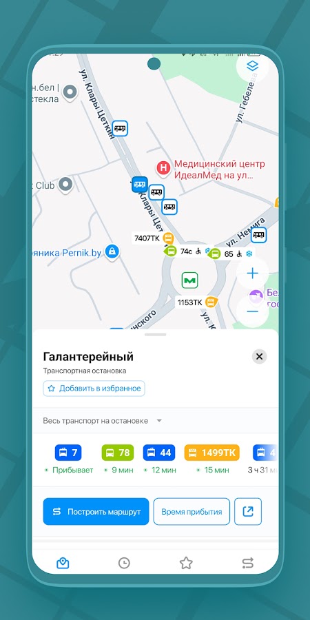 Планируйте маршрут с помощью приложения с учетом подходящих вам видов общественного транспорта — автобус, троллейбус, трамвай и маршрутное такси. Для построения маршрута выбирайте своё текущее местоположение, остановку транспорта или просто место на карте.