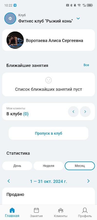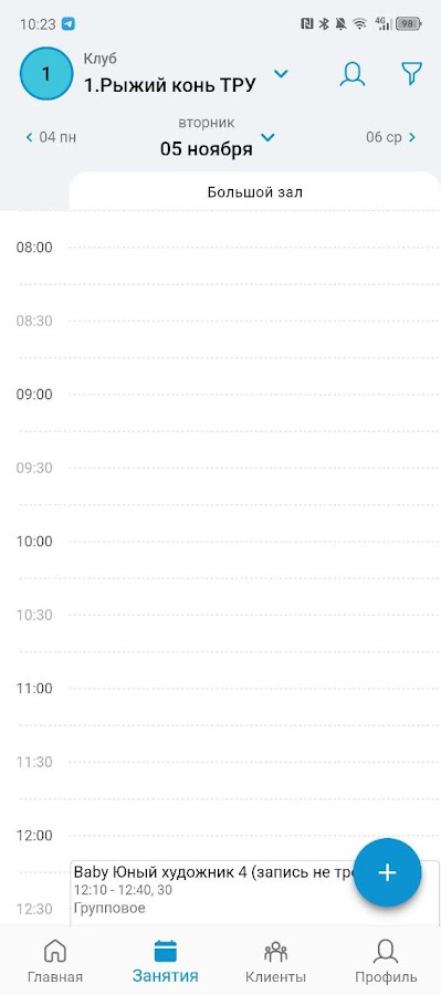 Позволяет тренерам клуба контролировать свои групповые занятия и персональные тренировки.