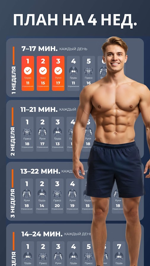 В приложении есть тренировки для пресса, груди, ног, рук и всего тела. Все программы разработаны экспертами. Ни для одной из них не нужно оборудование – забудьте о походах в зал. Тренировки занимают всего несколько минут, но они приведут вас в форму и помогут накачать красивый и сильный пресс дома. 🏠