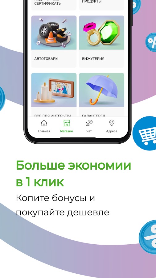 Зарегистрируйте виртуальную бонусную карту прямо в приложении и получайте мгновенные скидки, накапливайте баллы и используйте их при следующих покупках.