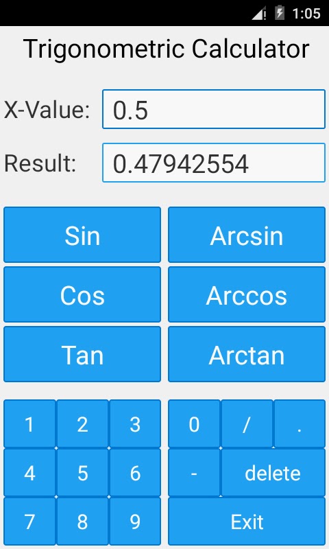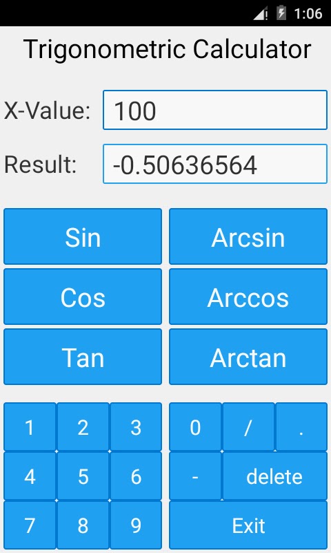 Это бесплатное математическое приложение вычисляет значения для наиболее важных тригонометрических функций: синус, косинус, тангенс, арксинус, арккосинус, арктангенс.
