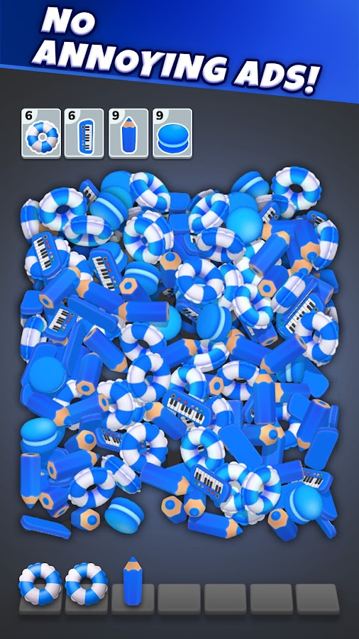 * Продолжайте сортировать и совмещать объекты, пока не уберете с экрана все фишки.