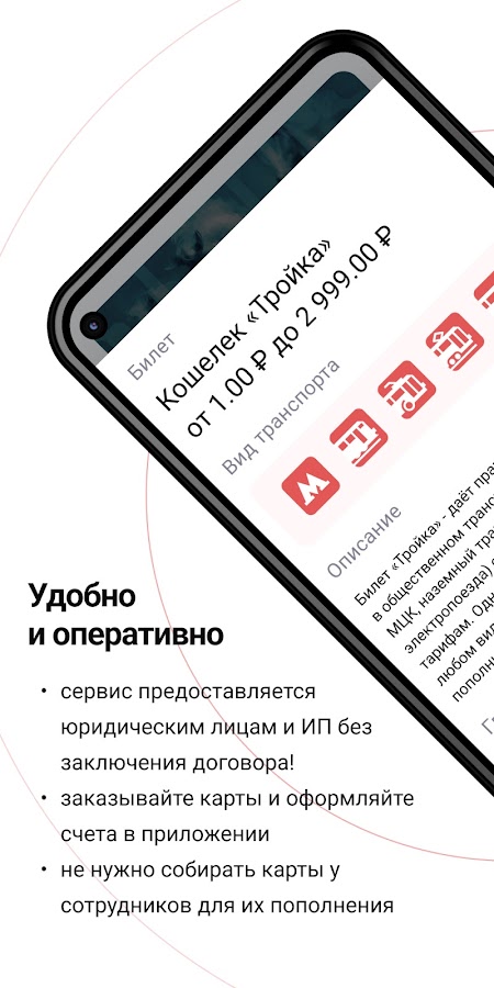 Приложение «Тройка Бизнес» от Мосгортранс позволяет легко покупать карты «Тройка» и проездные билеты на все виды общественного транспорта (Метро, Троллейбус, Автобус, Трамвай, Поезда и др.) по действующим тарифам (Кошелёк, Единый, Единый МЦД, ТАТ, Автобус и т. д.).