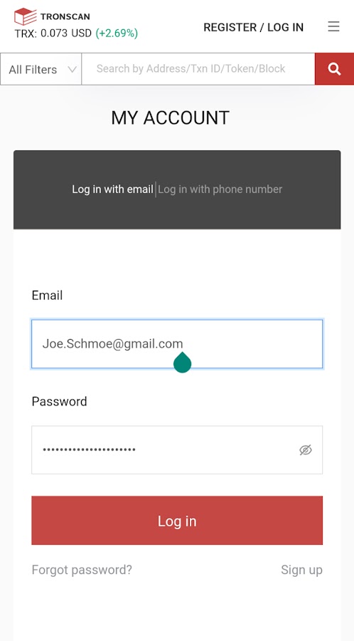 — Управление учетной записью TRONSCAN: зарегистрируйтесь/войдите, используя адрес электронной почты или номер телефона.