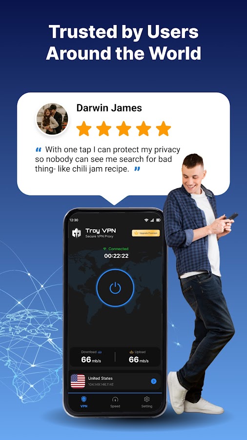 Troy VPN — это быстрое, надежное и безопасное приложение VPN, которое помогает защитить вашу конфиденциальность в Интернете и сохранить ваши данные в безопасности в любой сети, включая общедоступный Wi-Fi. Всего одним нажатием вы можете создать безопасное и зашифрованное подключение к Интернету.