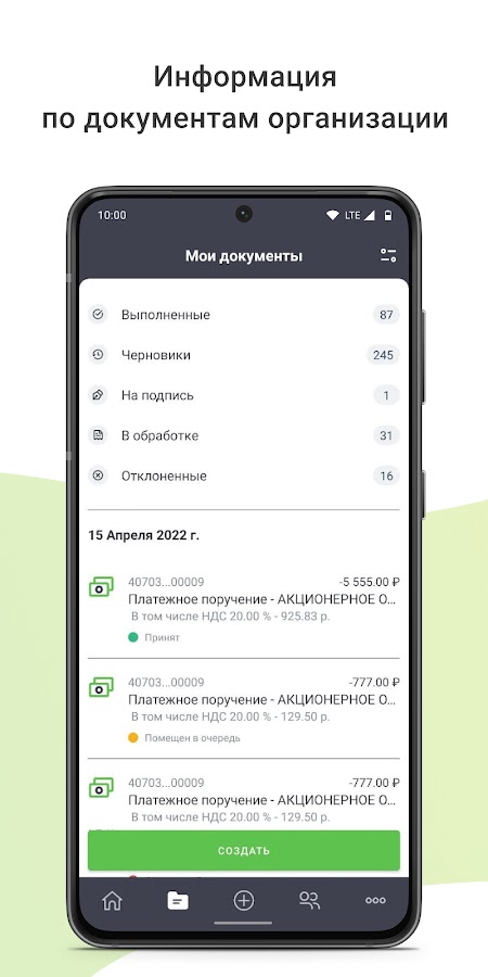 – Возможность отправки платежных поручений внутри приложения;