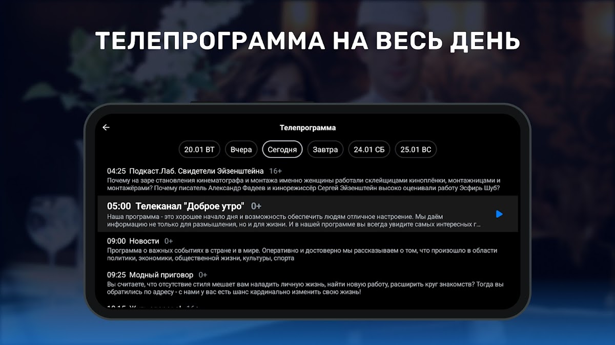 • ТВ программа передач (телепрограмма) на целый день;