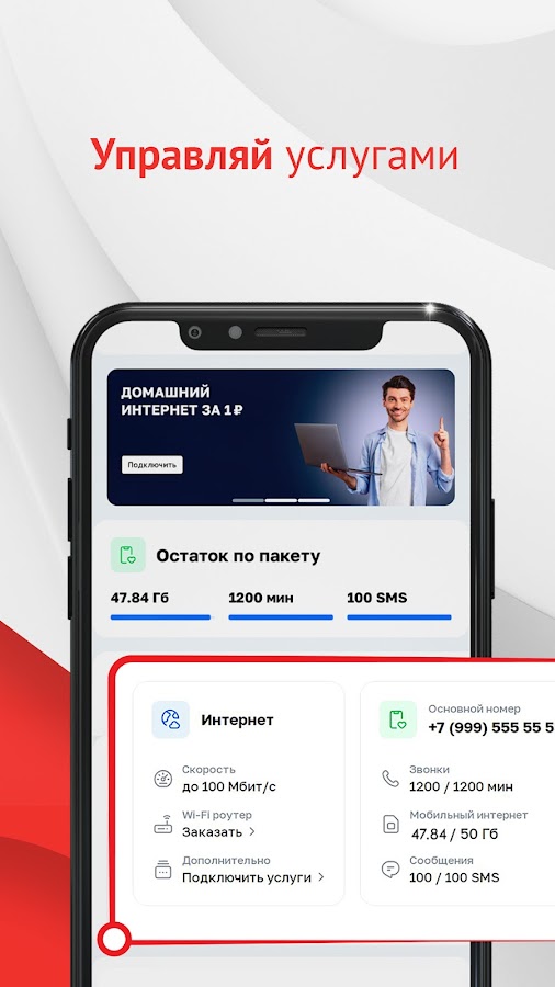 Актуальная информация о состоянии счета и подключенных услугах на экране вашего телефона: стоимость, скорость интернета, количество ТВ-каналов, подключенные услуги