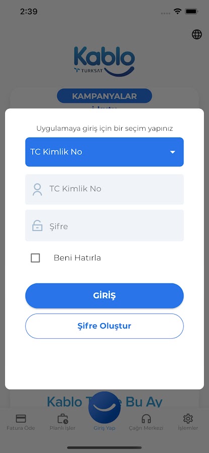 Для использования приложения у вас должен быть пароль для онлайн-транзакций Türksat. Вы можете получить свой пароль для онлайн-транзакций Türksat на сайте online.turksatkablo.com.tr или в нашем информационном центре по телефону 4440126.