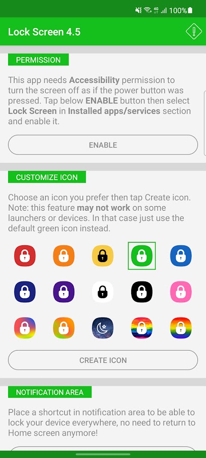 Android 9 и выше: Это приложение требует разрешения на доступность для выключения и блокировки экрана при нажатии кнопки питания.