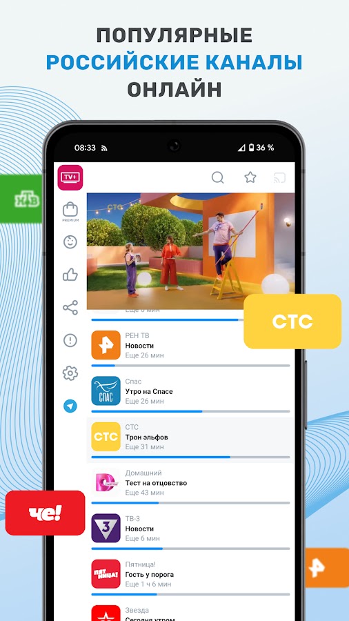 ТВ+ Эфир — это ваше бесплатное ТВ, которое предлагает кино, шоу, футбол и сериалы. Прямой эфир всегда с вами. Смотрите ТНТ, Первый канал, НТВ, СТС, Матч ТВ, 1 канал, РЕН ТВ, Карусель, ТВЦ, Россия с TV+! Скачайте бесплатный онлайн телевизор и смотрите тв-трансляции и тв каналы бесплатно!