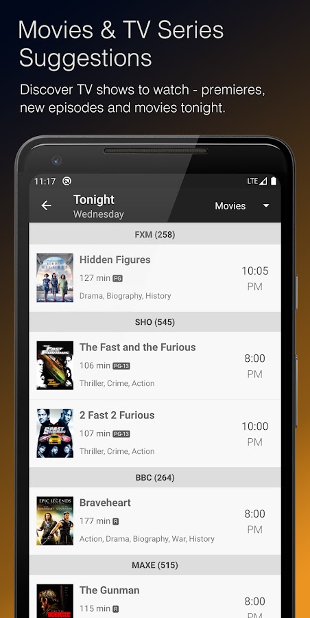 Телепрограмма и TV Show Guide Приложение также содержит предложения для телевизионных шоу и фильмов в прайм-тайм.