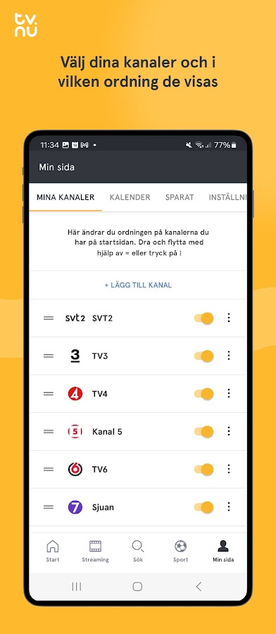 На стартовой странице вы получаете прямой обзор того, что происходит на телевидении и что нового в потоковом вещании. Вы легко настраиваете свою домашнюю страницу в разделе «Моя страница». Там вы можете добавлять и удалять каналы или изменять порядок их отображения. У нас есть все самые популярные потоковые каналы, такие как Netflix, SVT Play, Viaplay, Disney +, tv4play, Viafree, HBO Nordic, Dplay, AppleTV + и iTunes и более 200 телеканалов на выбор.