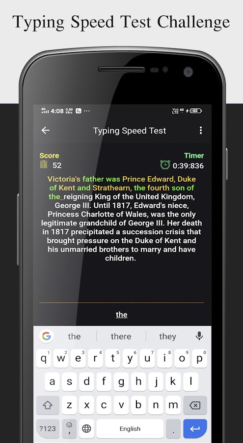 Приложение предоставляет абзац, который вам нужно ввести. Есть счетчик времени 60 секунд. Вам нужно набрать как можно больше слов в течение 60 секунд. Счет указывается в словах в минуту.