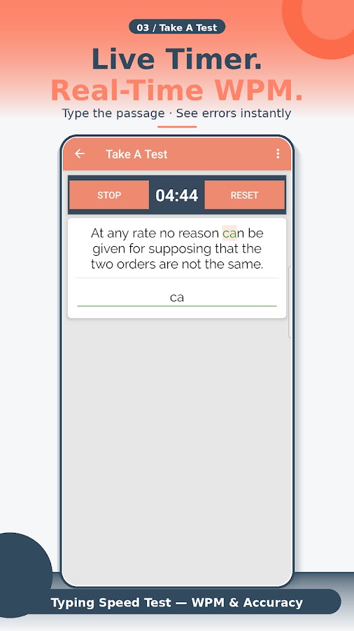 Приложение «Тест скорости печати для экзамена» поможет вам улучшить скорость печати, повысить точность и отслеживать количество слов в минуту с результатами в реальном времени. Практикуйтесь с помощью интерактивных уроков, тестов на скорость печати и увлекательных заданий, разработанных как для начинающих, так и для продвинутых пользователей. Это приложение — идеальный инструмент для улучшения скорости печати, измерения количества слов в минуту и повышения точности с результатами в реальном времени. Готовитесь ли вы к экзаменам, повышаете продуктивность или просто развлекаетесь, это приложение поможет вам стать более быстрым и точным наборщиком текста.