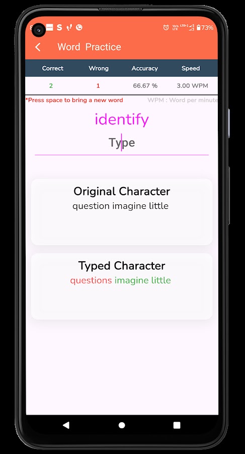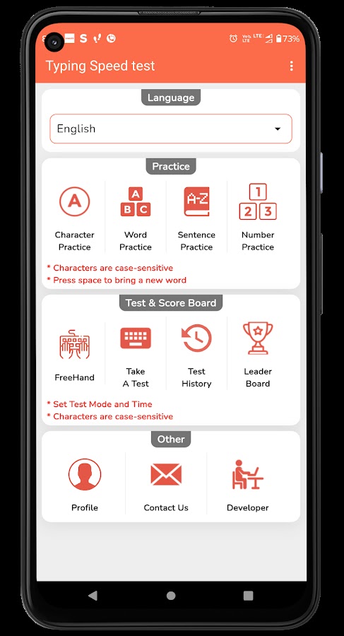 Приложение Typing Speed Test Pro полезно для проверки/измерения скорости набора текста пользователя. Научитесь печатать и узнайте, насколько быстро вы можете печатать. В приложении имеется богатый набор бесплатных уроков набора текста с такими вариантами, как сложный/средний/легкий набор текста, позволяющий попрактиковаться в наборе текста онлайн и научиться печатать. Буквы выделены, чтобы помочь вам сосредоточиться на вводе текста. С помощью этого приложения вы можете стать мастером набора текста или поиграть в игры с набором текста для развлечения. Вам необходимо добавить клавиатуру для конкретного языка для ввода на этом языке.