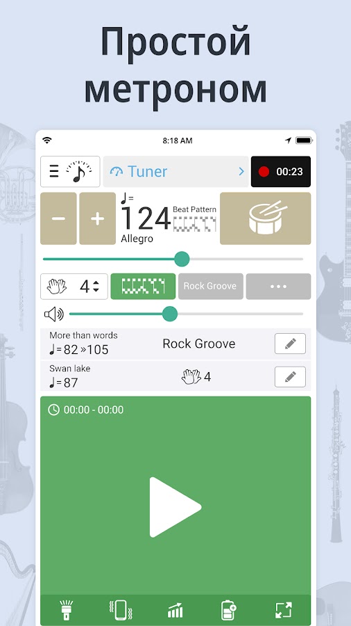Оно включает самый точный хроматический тюнер и профессиональный метроном, разработанные музыкантами. — Использование этого приложения очень быстрое и простое.